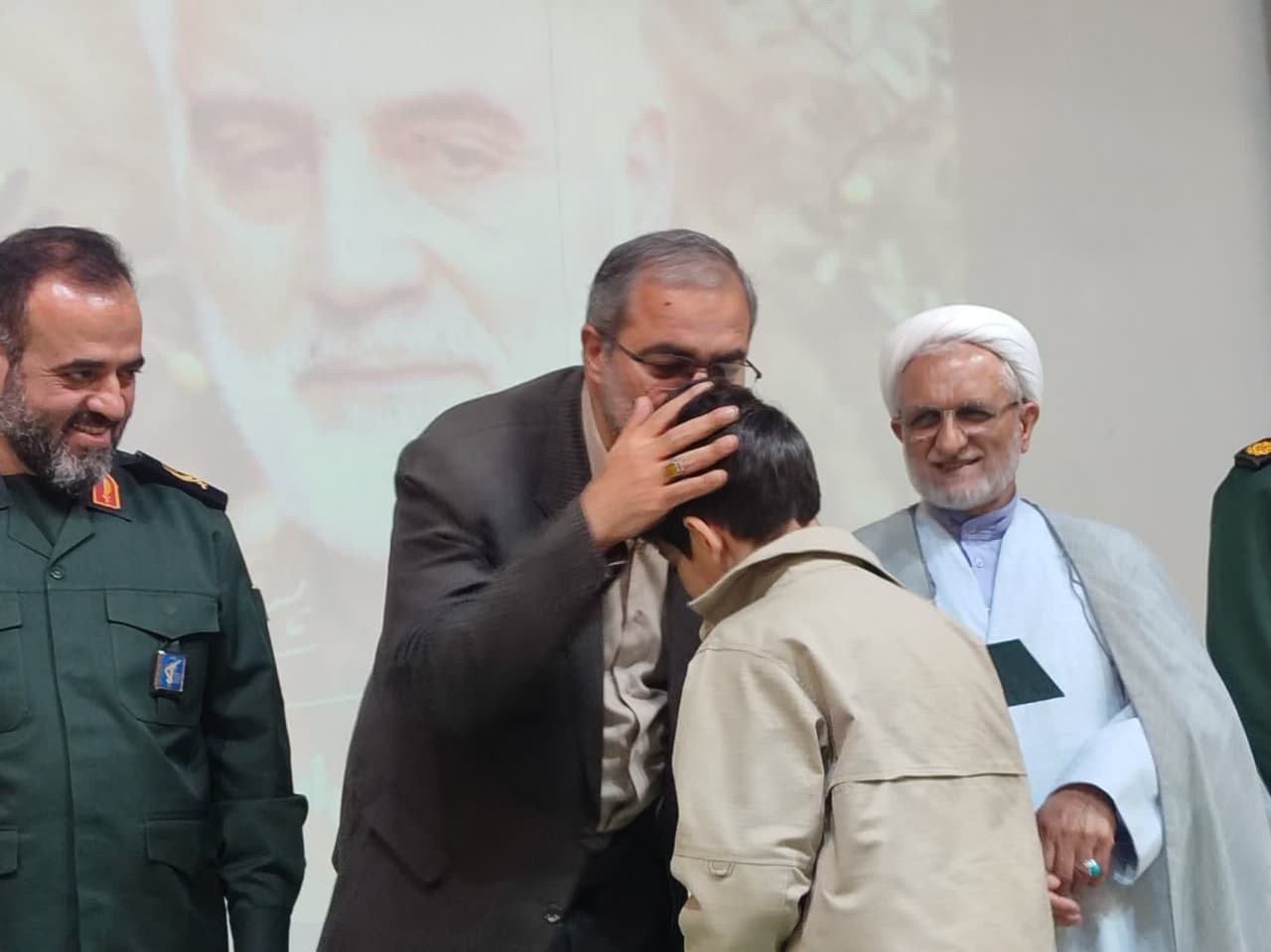 بوسه بر سر فرزند شهید مدافع حرم در همایش مدیریت جهادی در مکتب حاج قاسم