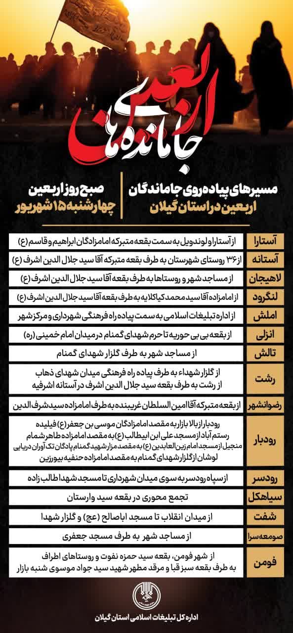 مهدوی با تاکید بر اینکه طبق اطلاعات به دست آمده در استان ولایتمدار گیلان امسال بسیاری از جاماندگان اربعین حسینی، چه اهل تشیع و چه اهلتسنن دلتنگی و عشق خود را نسبت به امام حسین (ع) در قالب حرکتهای عزاداری و پیادهرویهای طولانی از گوشه و کنار شهرها و روستاها به سمت بقاع متبرکه و اماکن مقدس نشان میدهند، گفت: دستههای عزاداری به سمت میدان شهدای ذهاب رشت در روز اربعین حسینی (ع) حرکت میکنند.