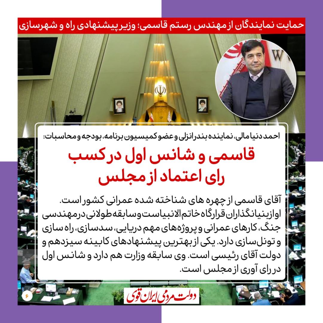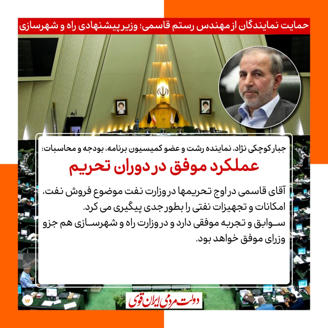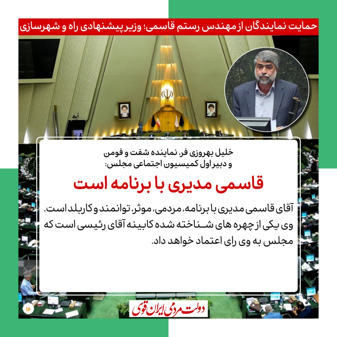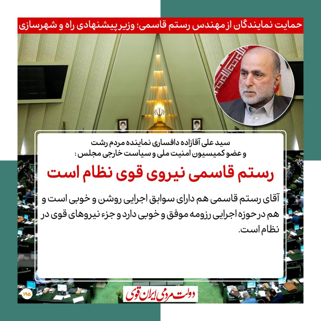 اختصاصی/صفیرگیلان؛تعدادی از نمایندگان مجلس شورای اسلامی با حمایت از عملکرد وزیر پیشنهادی راه و شهرسازی، تاکید کردند معرفی رستم قاسمی توسط رئیس‌جمهور با توجه به سوابق به جا بوده است.