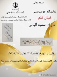 صفیر گیلان ؛نمایشگاه خوشنویسی «خیال قلم» با آثار نفیس و خیالانگیز هنرمند ممتاز، سمیه آلیانی، از ۱۳ تا ۱۶ آبان ۱۴۰۴ در نگارخانه عباسیه کهن مجتمع فرهنگی هنری فارابی اداره فرهنگ و ارشاد اسلامی شهرستان صومعهسرا برگزار میشود
