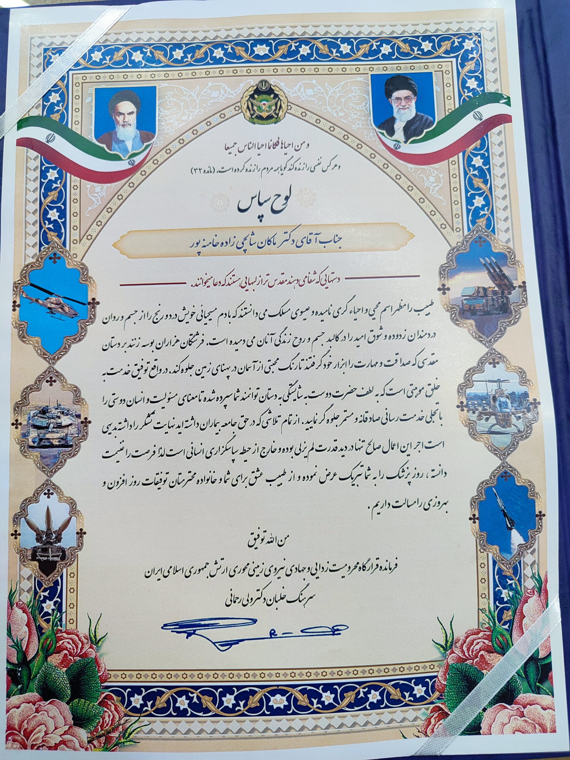 به گزارش خبرنگار صفیر گیلان از فومن؛سرهنگ دکتر رحمانی فرمانده قرارگاه محرومیت زدایی و جهادی نیروی زمینی محوری ارتش جمهوری اسلامی ایران به پاس زحمات ، تلاشهای بیدریغ و صادقانه پزشکان و جامعه سلامت شهرستان فومن در عرصه خدمت به بیماران این مرز و بوم لوح سپاسی را ارسال و اهدا نمود تا پزشکان بیمارستان امام حسن مجتبی (ع) و مراکز بهداشتی و درمانی شهرستان فومن بدانند که فرمانده شهر و استانشان او که در گوشه ای از کشور عزیز ایران با حس وطن پرستی برای امنیت و آبادانی این سرزمین تلاش میکند انها را فراموش نکرده است