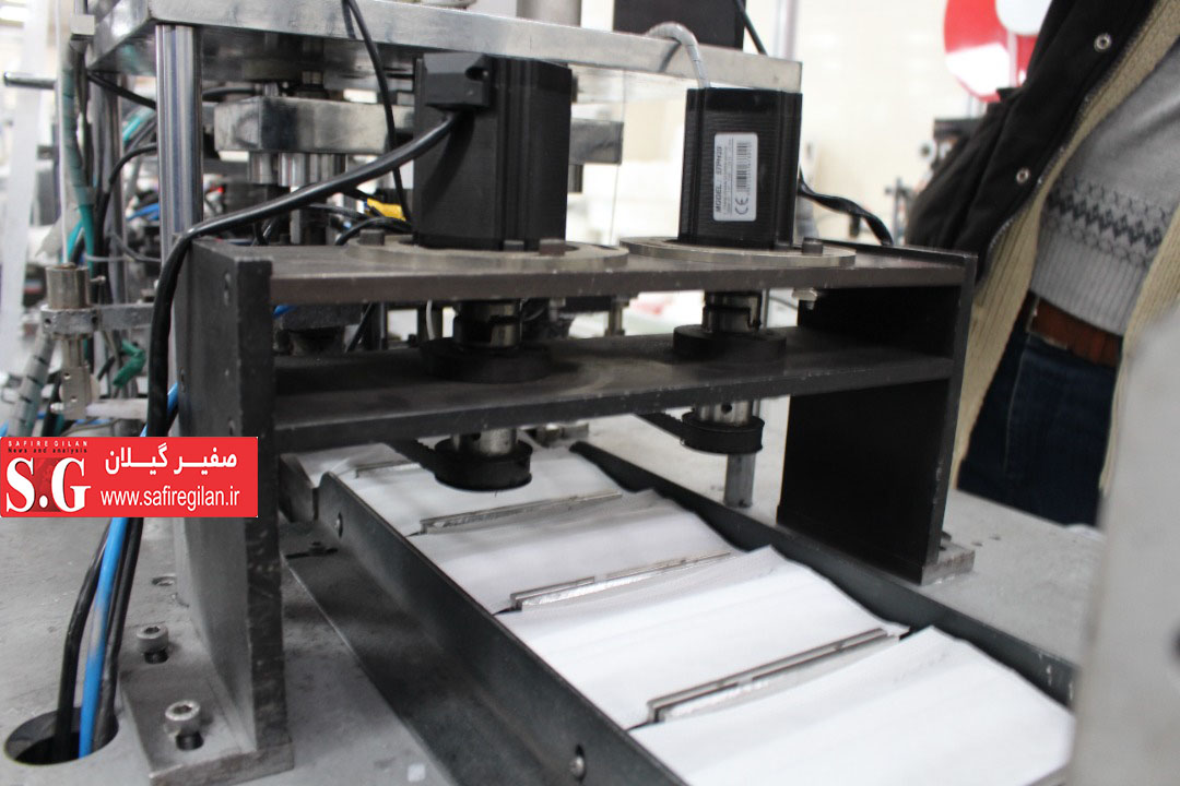 مدیریت این شرکت خطاب به دکتر مدنی گفت: تمام دستگاههای شرکت ما اتوماتیک است و در ایران چند نمونه از این دستگاههای تمام اتوماتیک وجود دارد که پارچه اسپاند باند، ملت بلون اول دستگاه تحویل و آخر دستگاه با کش بند تحویل میگیریم فقط نیروهای ما در بسته های ۵۰ تایی بسته بندی می کنند.