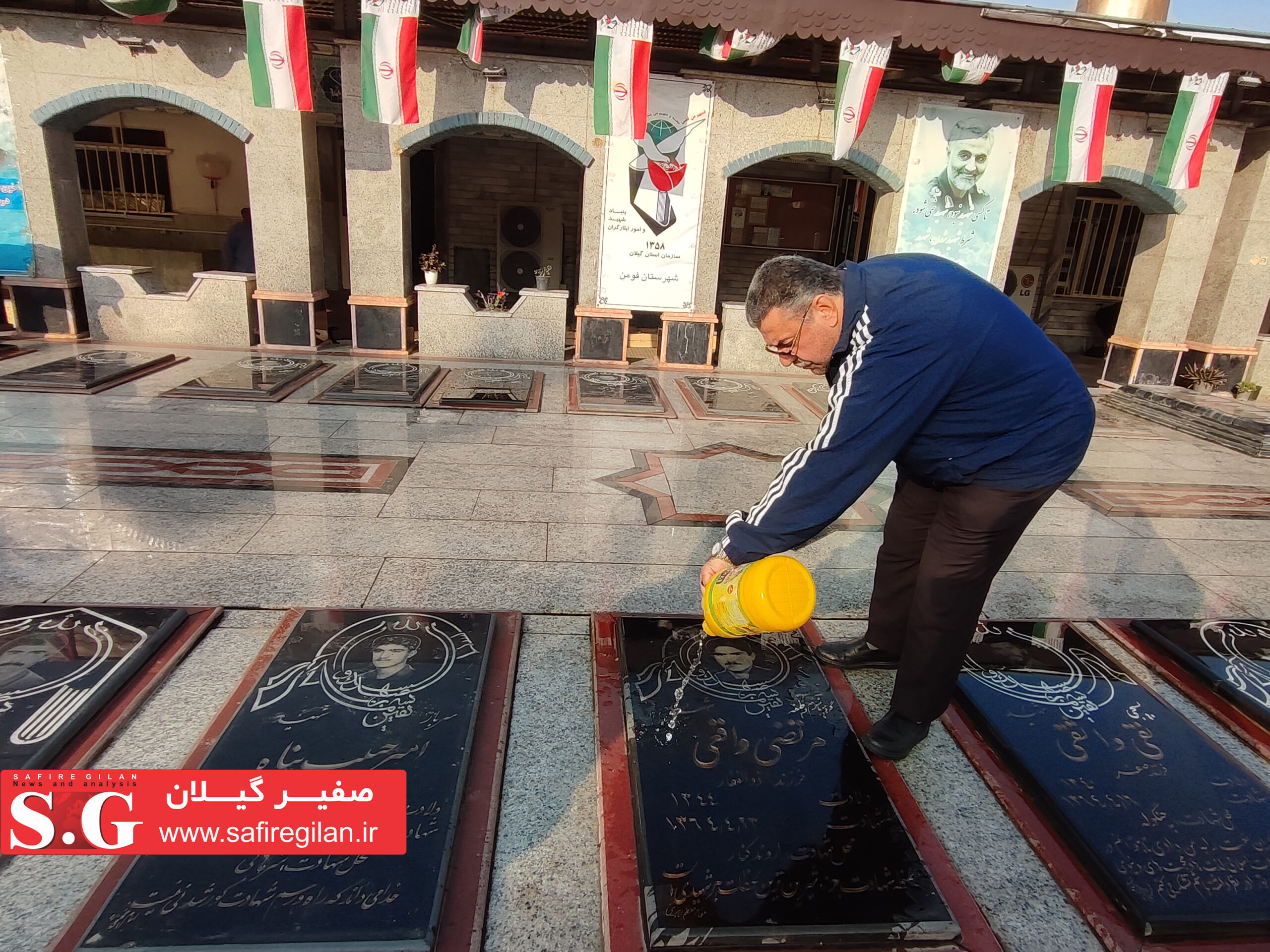 اختصاصی/صفیر گیلان؛امروز مزار شهدای شهر فومن به همت ورزشکاران  آب پاشی و غبار روبی شد و اهدای خون نیز به پاس قدردانی از شهدا اجرایی شد.